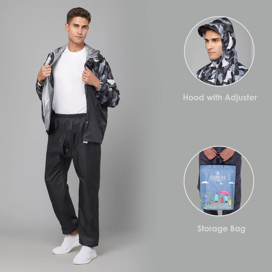 Napoleon Series Men's Waterproof Nylon Double Coating Reversible Raincoat with Hood and Reflector Logo at Back. Set of Top and Bottom. Printed Plastic Pouch with Rope (Grey, XX-Large)