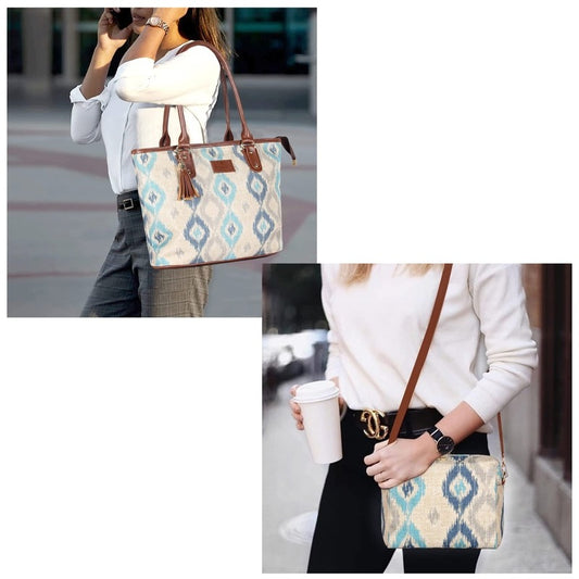 The Clownfish Combo of Percy Printed Handicraft Fabric Handbag for Women & The Clownfish Isla Printed Handicraft Fabric Crossbody Sling Bag for Women (Pearl with Patola Design)