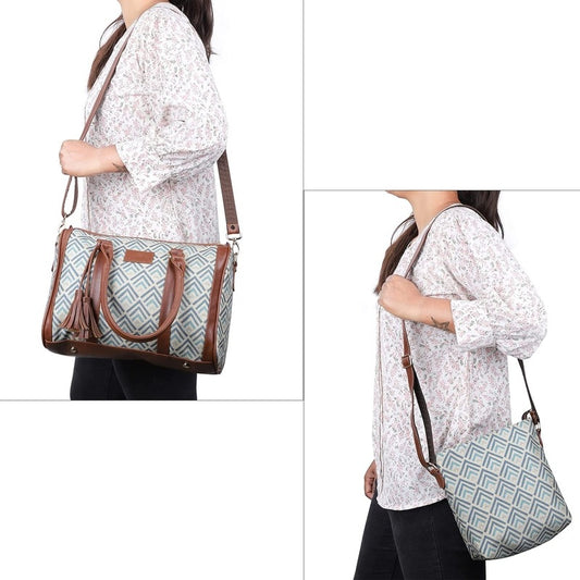 The Clownfish Combo of Lorna Printed Handicraft Fabric Handbag and Aahna Polyester Crossbody Sling bag for Women (White with Grey Stripes)