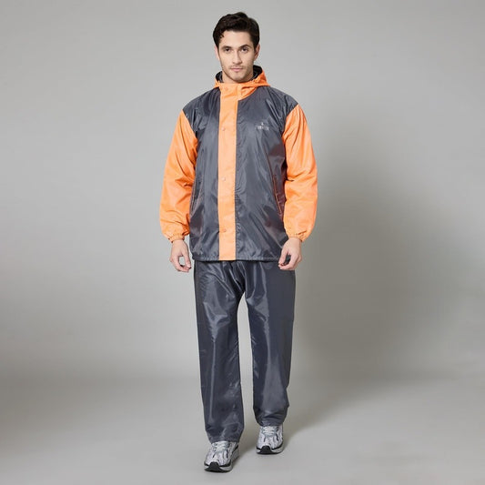 Raincoats for Men Waterproof Reversible for Bike Double Layer with Hood Rain Coat for Men. Set of Top and Bottom. Color Block Series (Grey/Orange, 3XL)