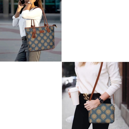 The Clownfish Combo of Percy Printed Handicraft Fabric Handbag for Women & The Clownfish Isla Printed Handicraft Fabric Crossbody Sling Bag for Women (Peacock Blue)