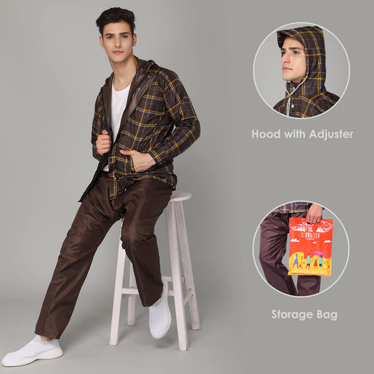 Monarch Pro Series Men's Waterproof Polyester Double Coating Reversible Raincoat with Hood and Reflector Logo at Back for Night Travelling. Set of Top and Bottom (Dark Brown, XXL)