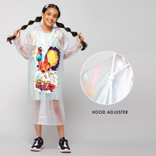 Toon Caper Series Kids Waterproof PVC Longcoat with Adjustable Hood & Extra Space for Backpack/Schoolbag Holding. Printed Plastic Pouch. Kid Age-4-5 years (Link White-Transparent)