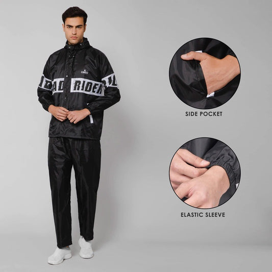 The Clownfish Road Rider Men's Waterproof Raincoat Polyester Double Coating Reversible Rain Suit with Adjustable Hood & Inner Mobile Pocket. Set of Top and Bottom. Printed Plastic Pouch (Black, Large)