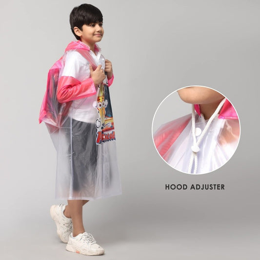 Toon Caper Series Kids Waterproof PVC Longcoat with Adjustable Hood & Extra Space for Backpack/Schoolbag Holding. Printed Plastic Pouch. Kid Age-4-5 years (Milky White -Transparent)
