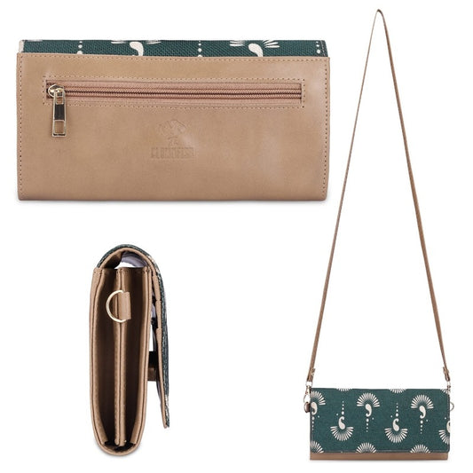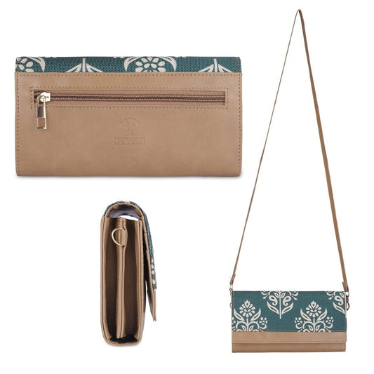 Jolene Printed Handicraft Fabric & Vegan Leather Ladies Wallet Purse Sling Bag with Multiple Card Slots & Shoulder Belt (Bottle Green)