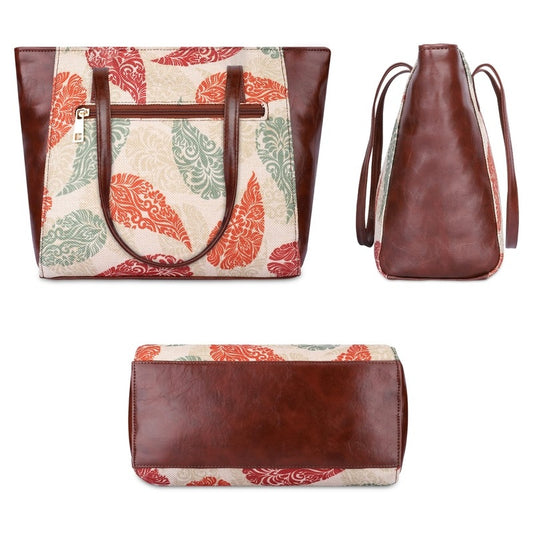 Valentine Printed Handicraft Fabric & Faux Leather Handbag for Women Ladies Tote for Women College Girls (Cream-Leaf Print)