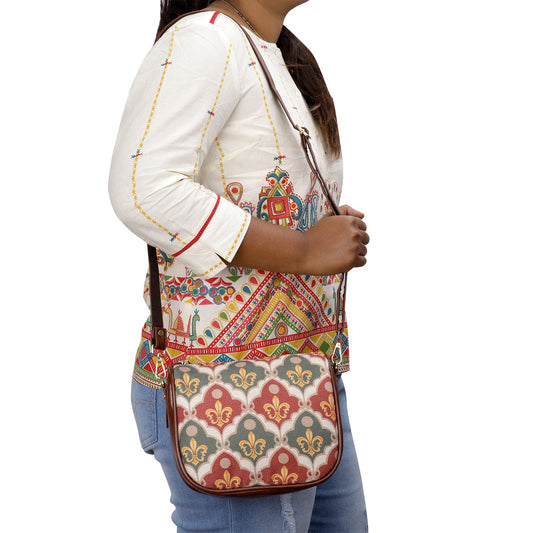 Isla Printed Handicraft Fabric Crossbody Sling bag for Women Casual Party Bag Purse with Adjustable Shoulder Strap and Printed Design for Ladies College Girls (Cream)