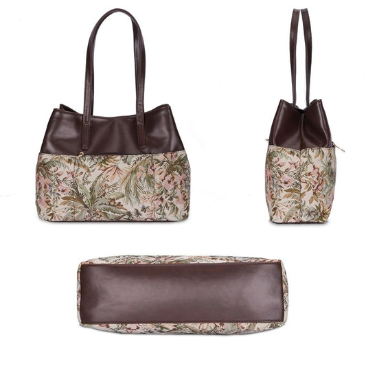 Calista Tapestry & Faux Leather Handbag for Women Office Bag Ladies Shoulder Bag Tote For Women College Girls (Beige)