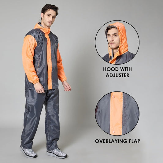 Raincoats for Men Waterproof Reversible for Bike Double Layer with Hood Rain Coat for Men. Set of Top and Bottom. Color Block Series (Grey/Orange, 2XL)