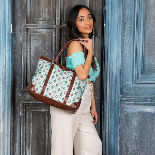 Miranda Series 15.6 inch Laptop Bag For Women Printed Handicraft Fabric & Faux Leather Office Bag Briefcase Hand Messenger bag Tote Shoulder Bag (Skyblue-Diamond Design)