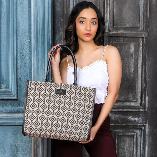 Opulence Series Multipurpose Handbag For Women Box Bag 14 inch Laptop Bag Tote Printed Handicraft Fabric & Faux Leather Bag (Black-Geometric Design)