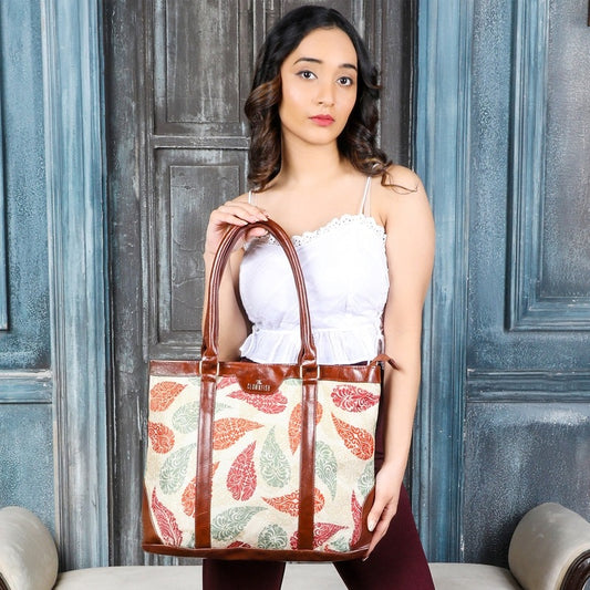 Miranda Series 15.6 inch Laptop Bag For Women Printed Handicraft Fabric & Faux Leather Office Bag Briefcase Hand Messenger bag Tote Shoulder Bag (Cream-Leaf Print)Regular price ₹1,399Sale price ₹1,399 Regular priceUnit price / per₹3,999(65% off)Sale