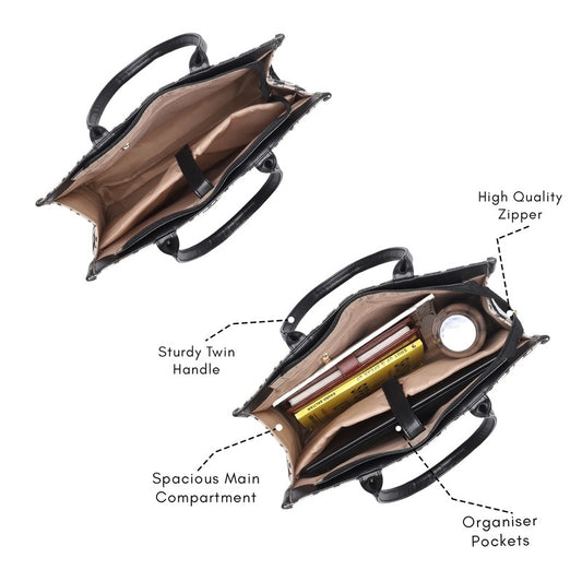 Opulence Series Multipurpose Handbag For Women Box Bag 14 inch Laptop Bag Tote Printed Handicraft Fabric & Faux Leather Bag (Black-Hexagon Design)Regular price ₹1,199Sale price ₹1,199 Regular priceUnit price / per₹3,999(70% off)Sale