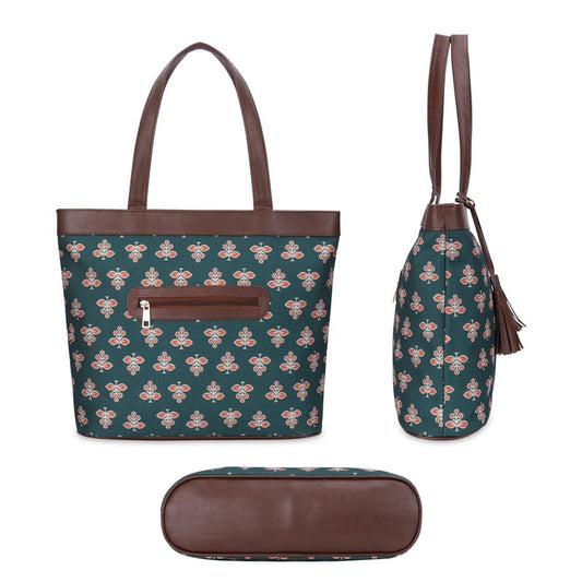 Casey series 15.6 inch Laptop Bag For Women Printed Handicraft Fabric & Faux Leather Office Bag Briefcase Hand Messenger bag Tote Business Bag (Persian Green)