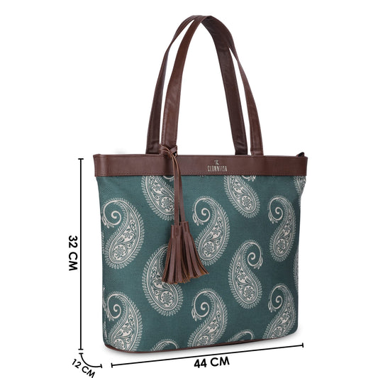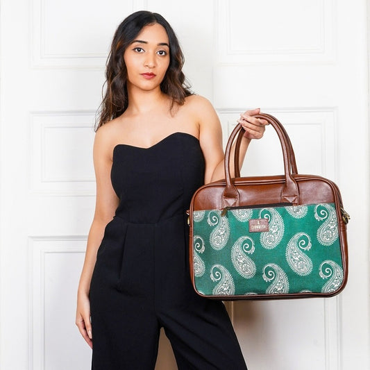 Casey series 15.6 inch Laptop Bag For Women Printed Handicraft Fabric & Faux Leather Office Bag Briefcase Hand Messenger bag Tote Business Bag (Fern Green)
