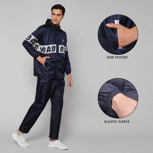 Road Rider Men's Waterproof Raincoat Polyester Double Coating Reversible Rain Suit with Hood & Inner Mobile Pocket. Set of Top and Bottom. Printed Plastic Pouch (Navy Blue, Large)