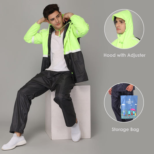 Raincoats for Men Waterproof Reversible for Bike Double Layer with Hood Rain Coat for Men. Set of Top and Bottom. Color Block Series (Black/Neon, L)