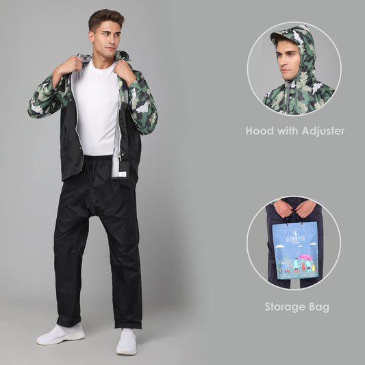 The Clownfish Road Rider Men's Waterproof Raincoat Polyester Double Coating Reversible Rain Suit with Adjustable Hood & Inner Mobile Pocket. Set of Top and Bottom. Printed Plastic Pouch (Black, Large)