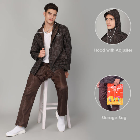 Francis Series Mens Waterproof Polyester Double Coating Reversible Raincoat with Hood and Reflector Logo at Back. Set of Top and Bottom. Printed Plastic Pouch with Rope (Brown, XL)