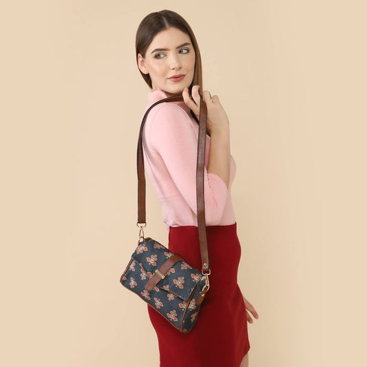 Odelina Series Printed Handicraft Fabric Sling Bag Handbag for Women Crossbody Bag Office Bag Ladies Single Shoulder Bag with Snap Flap Closure & Shoulder Belt For Women (Dark Grey)