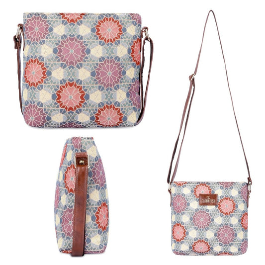Isla Printed Handicraft Fabric Crossbody Sling bag for Women Casual Party Bag Purse with Adjustable Shoulder Strap and Printed Design for Ladies College Girls (Dark Grey)