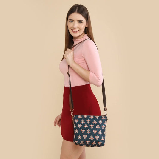 Isla Printed Handicraft Fabric Crossbody Sling bag for Women Casual Party Bag Purse with Adjustable Shoulder Strap and Printed Design for Ladies College Girls (Peacock Blue)