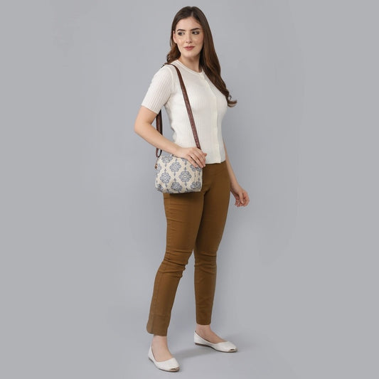 Isla Printed Handicraft Fabric Crossbody Sling bag for Women Casual Party Bag Purse with Adjustable Shoulder Strap and Printed Design for Ladies College Girls (Off White)