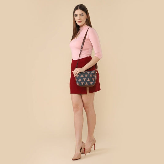 Isla Printed Handicraft Fabric Crossbody Sling bag for Women Casual Party Bag Purse with Adjustable Shoulder Strap and Printed Design for Ladies College Girls (Slate Grey)