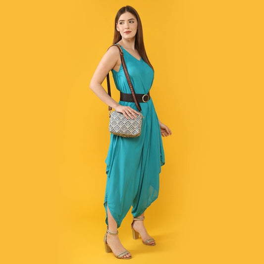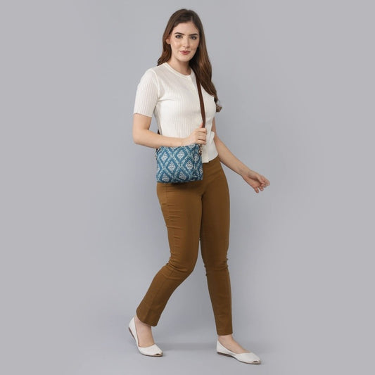 Isla Printed Handicraft Fabric Crossbody Sling bag for Women Casual Party Bag Purse with Adjustable Shoulder Strap and Printed Design for Ladies College Girls (Peacock Blue)
