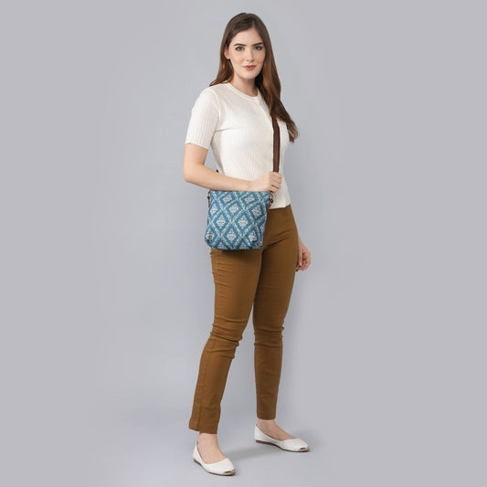 Isla Printed Handicraft Fabric Crossbody Sling bag for Women Casual Party Bag Purse with Adjustable Shoulder Strap and Printed Design for Ladies College Girls (Blue)