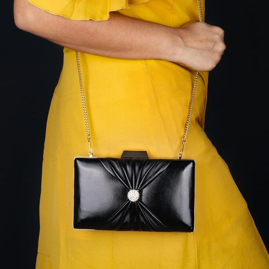 Elegant Faux Leather Clutch with Detachable Chain Strap | Evening Bag | Size: 21x3x13 cm | Black