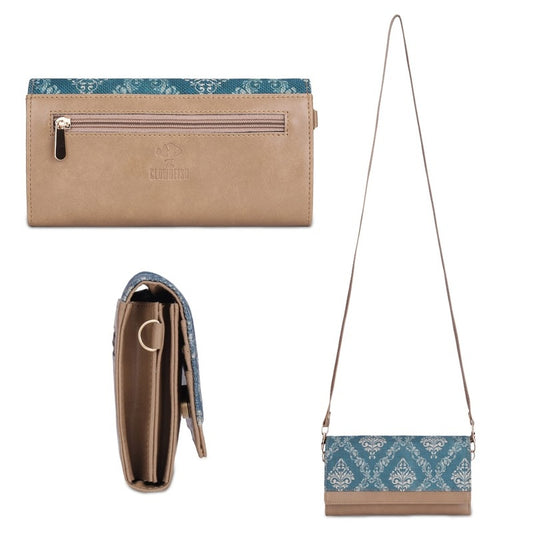 Women Erika Printed Handicraft Fabric & Vegan Leather Ladies Wallet Purse Sling Bag With Multiple Card Slots & Shoulder Belt (Cream)
