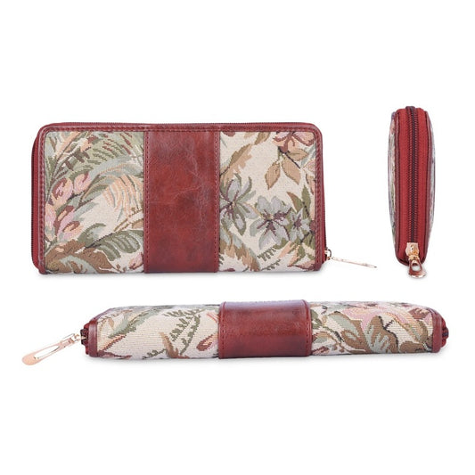Aria Collection Tapestry Fabric & Faux Leather Zip Around Style Womens Wallet Clutch Ladies Purse with Card Holders (Beige)