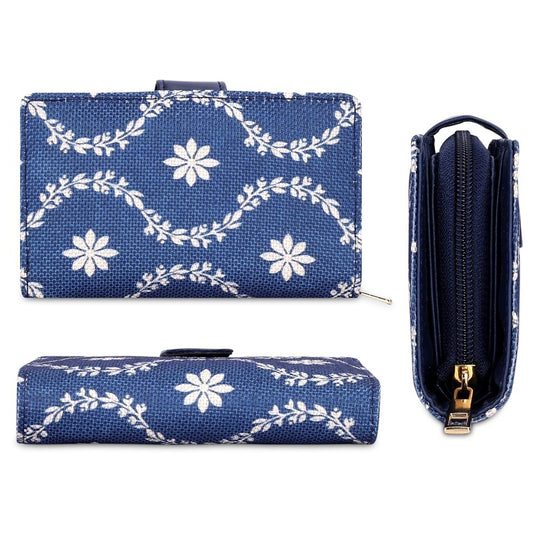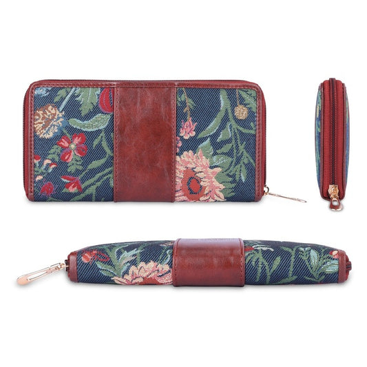 Aria Collection Tapestry Fabric & Faux Leather Zip Around Style Womens Wallet Clutch Ladies Purse with Card Holders (Navy Blue- Floral)