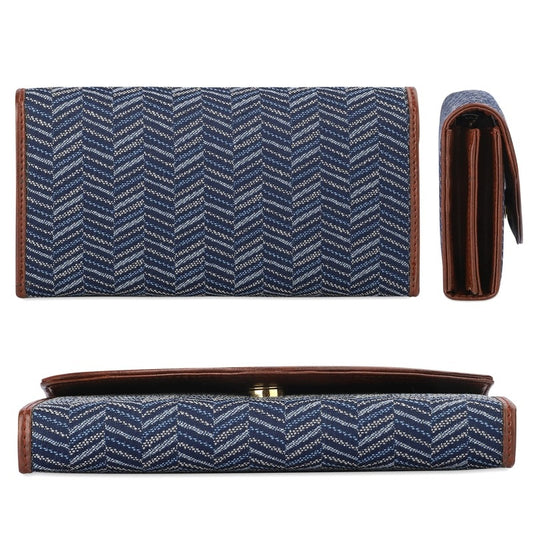 Mia Collection Tapestry Fabric & Faux Leather Snap Flap Closure Womens Wallet Clutch Ladies Purse with Multiple Card Holders (Blue-Stripes)